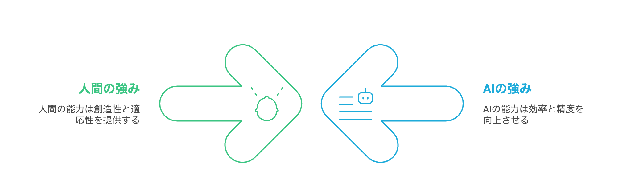 業務プロセスにAIを導入する際、最も重要なのは「何を自動化するか」だけでなく、「どのようにAIと人間が協働するか」の設計です。 効果的な役割分担により、それぞれの強みを活かした相乗効果が生まれます。