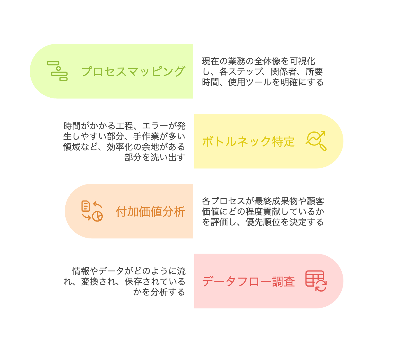 時間がかかる工程、エラーが発生しやすい部分、手作業が多い領域など、効率化の余地がある部分を洗い出す - 付加価値分析